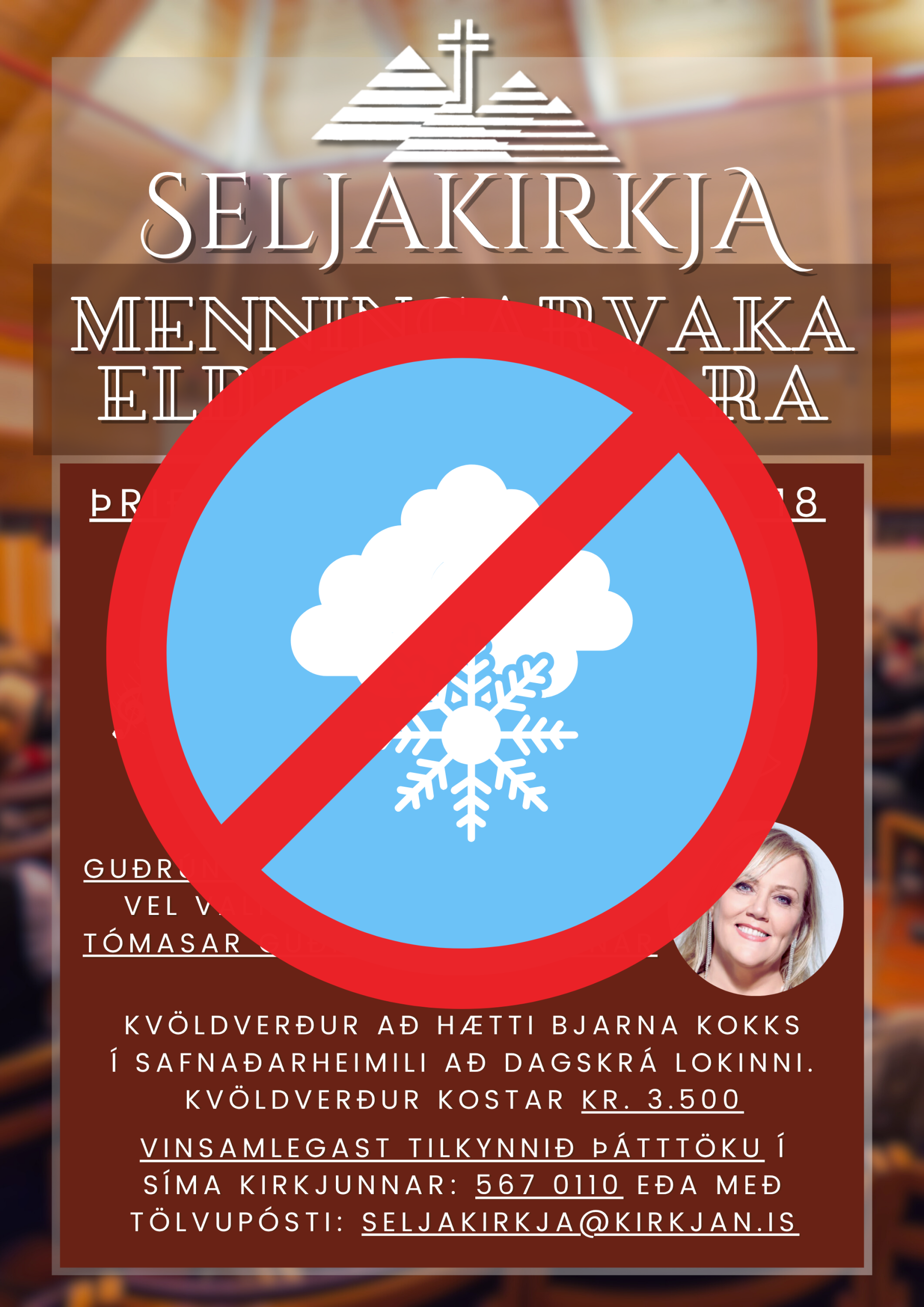 Vegna snjóþunga og slæmrar færðar neyðumst við til þess að fella niður Menningarvöku eldri borgara kvöldið 28. október.