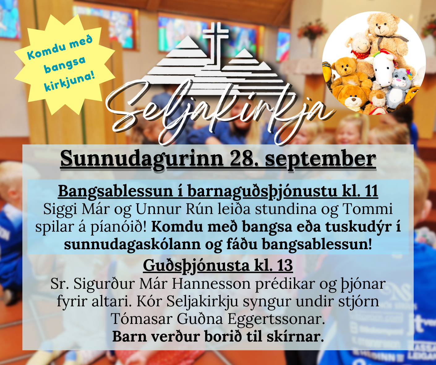 Bangsablessun í barnaguðsþjónusta kl. 11 – Siggi Már og Unnur Rún leiða stundina og Tommi spilar undir á píanóið. Boðið verður upp á bangsablessun í stundinni og kirkjugestir hvattir til að koma með bangsa eða tuskudýr í kirkjuna.