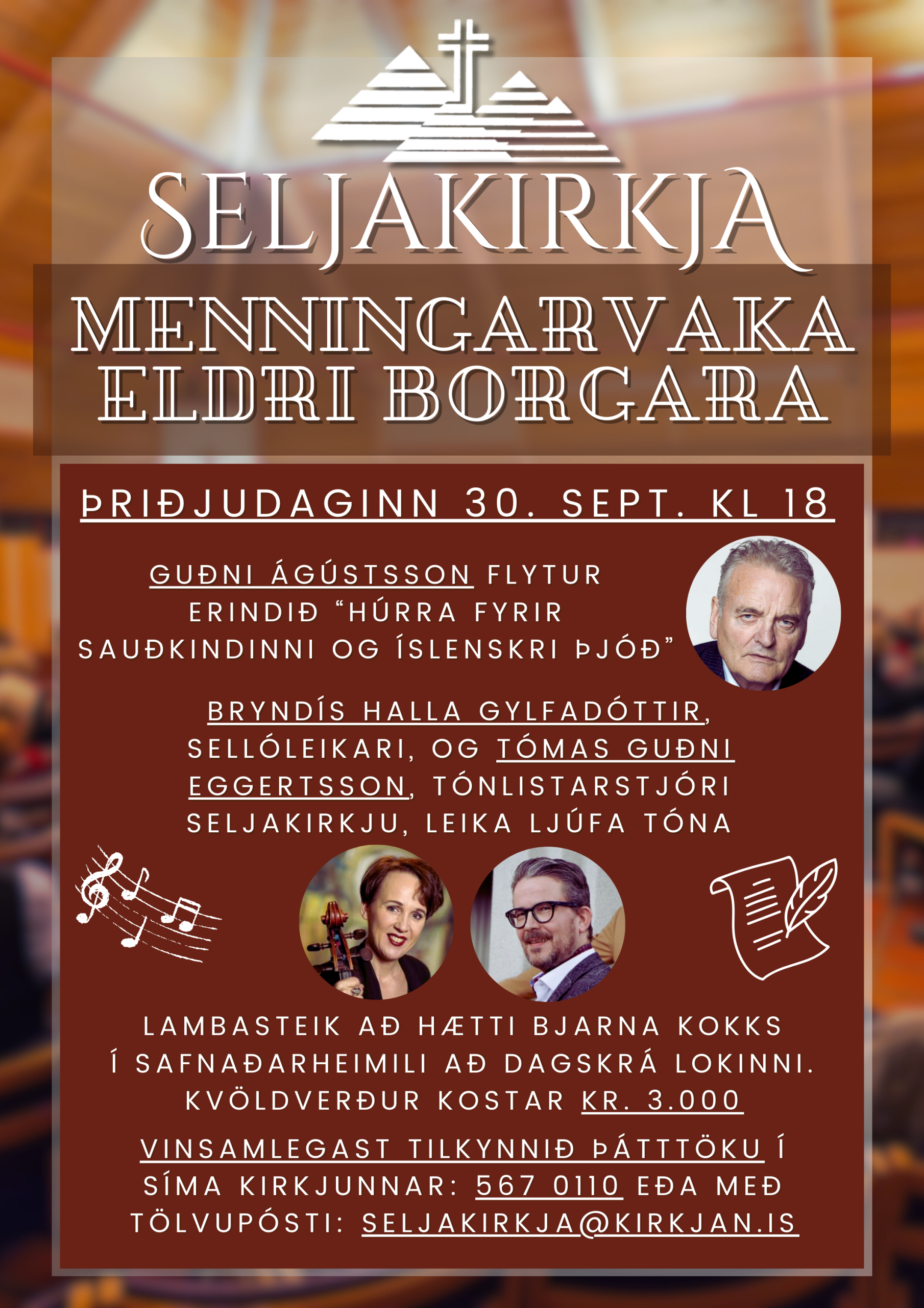 Þá er komið að fyrstu Menningarvöku vetrarins í Seljakirkju. Menningarvökur eldri borgara eiga sér stað síðasta þriðjudag hvers mánaðar, en þar er jafnan boðið uppá áheyrileg erindi og skemmtilegan tónlistarflutning í helgidómnum, en að stundinni lokinni er boðið til kvöldverðar í skemmtilegu samfélagi í safnaðarheimili.