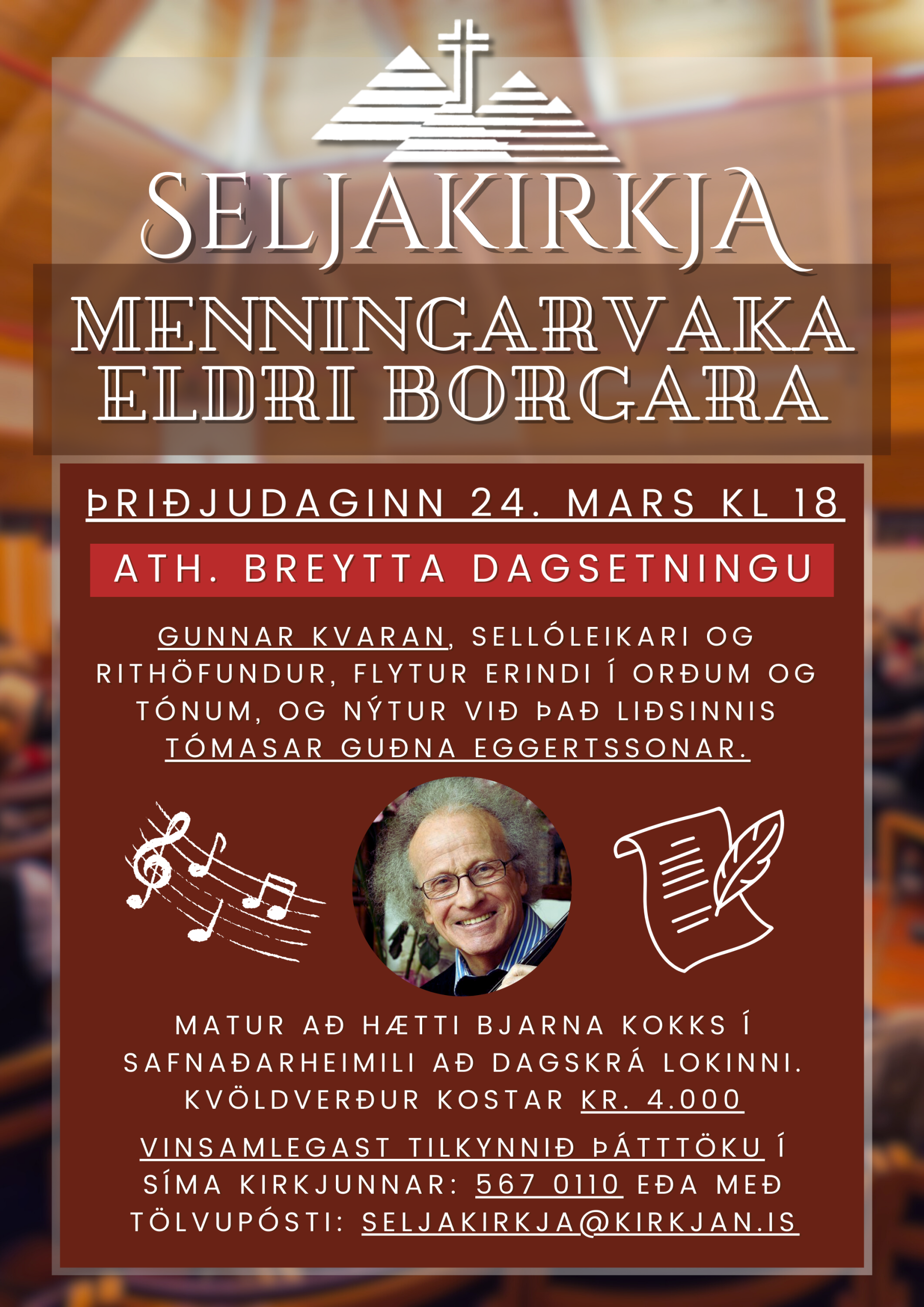 Þá líður að næstu menningarvöku eldri borgara í Seljakirkju, en boðið verður uppá spennandi dagskrá þann 24. mars næstkomandi.