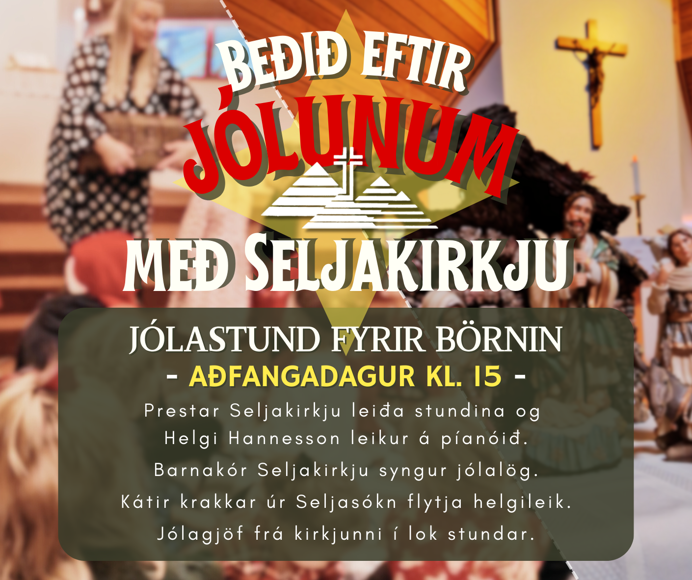 Biðin eftir jólunum getur verið löng og erfið, sérstaklega fyrir þau ynstu. Jólastund barnanna í Seljakirkju, Beðið eftir jólunum, styttir biðina! Aðfangadag, 24. desember kl. 15.00 - Beðið eftir jólunum. Prestar kirkjunnar og Bára leiða stundina og Helgi Hannesson spilar á píanóið. Barnakór Seljakirkju syngur undir stjórn Rósalindar Gísladóttur. Kátir krakkar úr Seljasókn leika helgiheik. ...