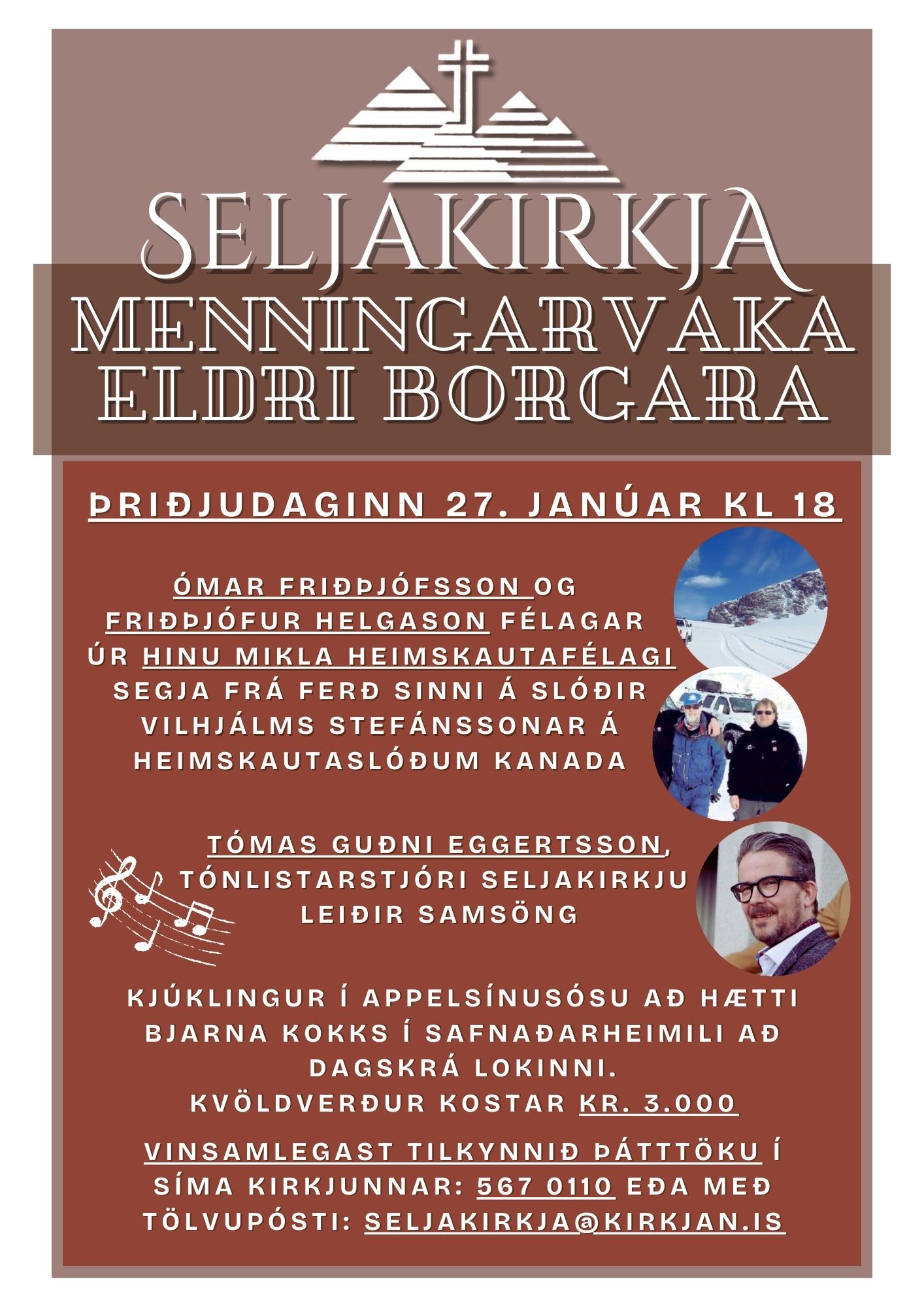 Þriðjudagskvöldið 27. janúr kl. 18 verður næsta Menningarvaka eldri borgara í Seljakirkju Að venju fáum við til okkar góða gesti Þeir Ómar Friðþjófsson og Friðþjófur Helgason, félagar úr Hinu mikla heimskautafélagi, segja frá ferð sinni á slóðir Vilhjálms Stefánssonar á heimskautaslóðum Kanada Að því loknu mun Tómas Guðni Eggertsson leiða samsöng Kjúklingur í appelsínusósu að ...