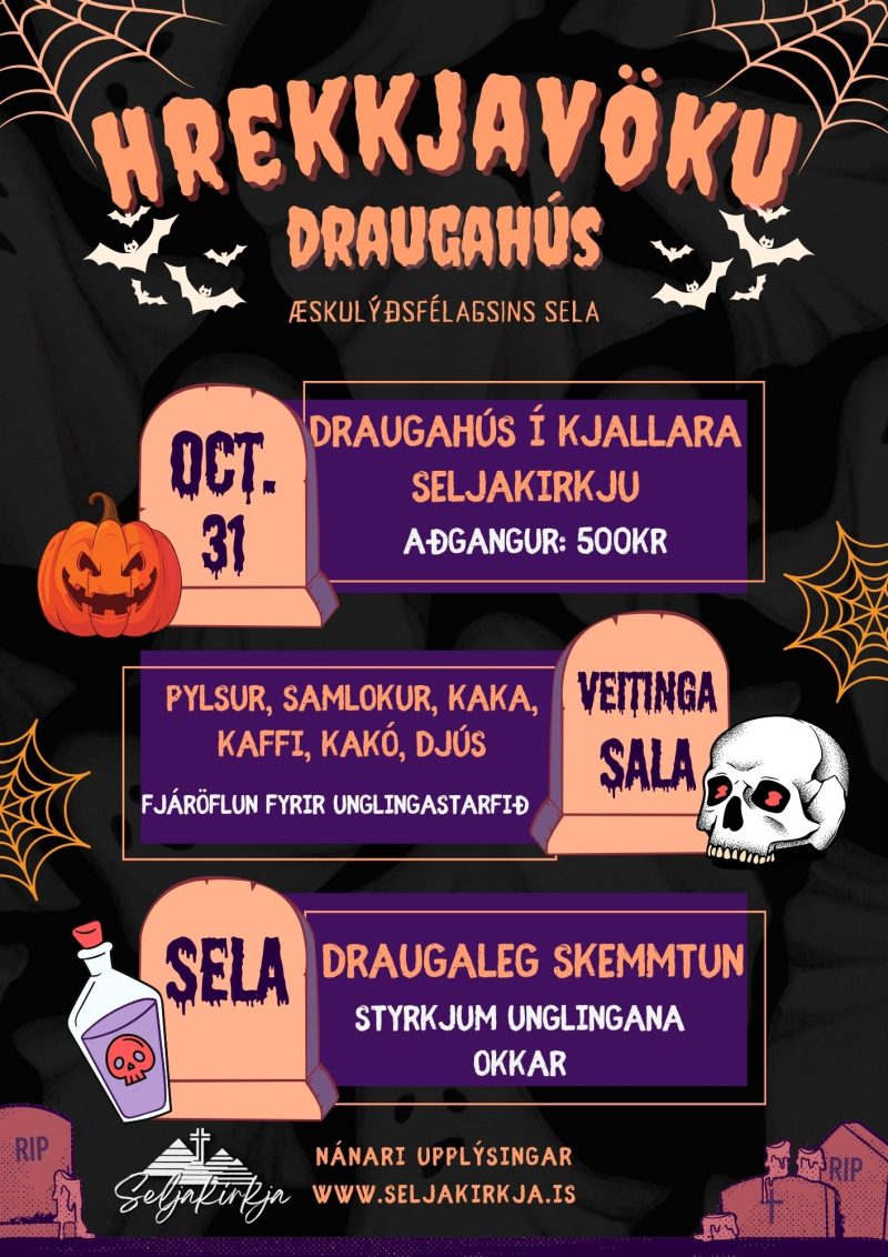 Föstudaginn 31. október mun Æskulýðsfélagið Sela standa fyrir Hrekkjavöku Draugahúsi í Seljakirkju á milli 18 og 21