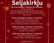 Það er nóg um að vera alla aðventuna í Seljakirkju Fyrsti sunnudagur í aðventu, 30. nóvember Aðventuhátíð kl. 17 ...